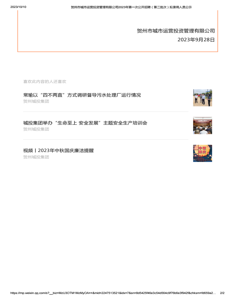 賀州市城市運營投資管理有限公司2023年第一次公開招聘(第二批次)擬錄用人員公示